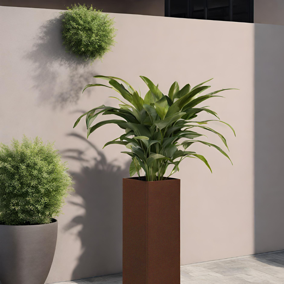 Up is a square and tall plant pot, made of steel.